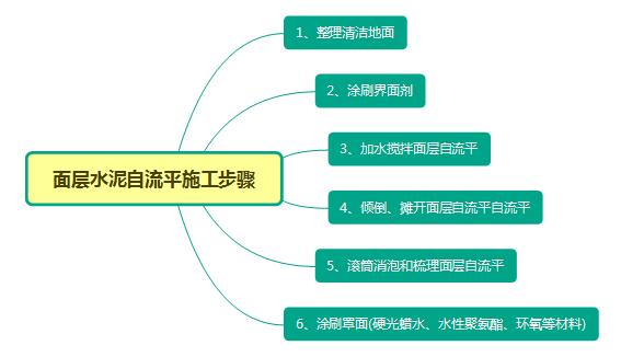 面層水泥自流平在施工的時候一般包括整理清潔地面、涂刷界面劑、加水攪拌面層自流平、傾倒、攤開、滾筒消泡、梳理和涂刷罩面,下面我們就針對每一步驟具體的來分析介紹下!